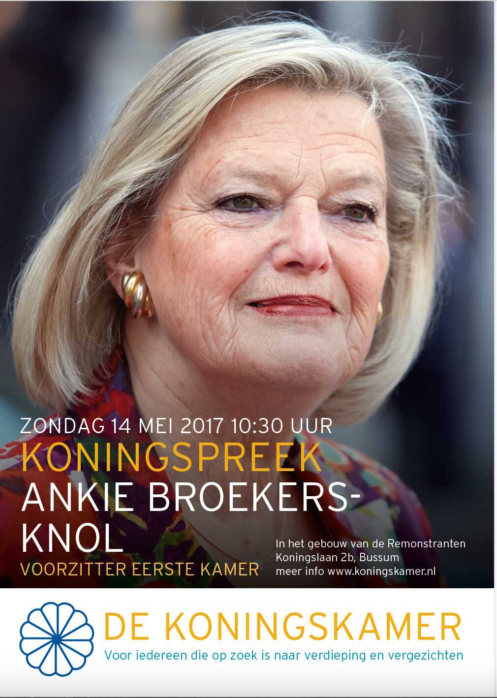 Op 14/05/2017 sprak Ankie Broekers in De Koningskamer (Koningslaan 2b in Bussum). Klik op het affiche voor een uitvergroting.